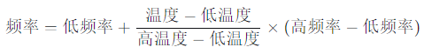 线性插值基于两点确定一条直线的思想。已知输入量(温度)在两个边界点(低温度、高温度)对应输出量(频率)的两个边界值(低频率、高频率),则对于任意介于两者之间的输入量,其输出量可通过直线方程计算得出。公式如下: