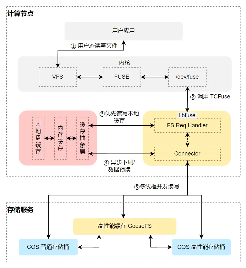 高性能客户端 GooseFS MountPoint:基于腾讯云自研 TCFuse 提供的高性能 POSIX 语义客户端。允许您将 COS 存储桶作为本地文件系统挂载到您的操作系统上,让计算层可以像本地文件系统一样访问 COS 存储桶。