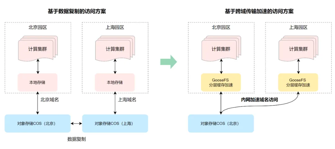 受限于 GPU 资源的多地域分布,跨地域的数据访问需求随之而来。传统架构下需要将数据复制多份,并通过不同域名拷贝到对应园区的计算集群的本地存储中,数据存在多次拷贝动作;腾讯云基于高性能内网传输加速能力为 GPU 多地训练架构提供了高效、便捷的方案。