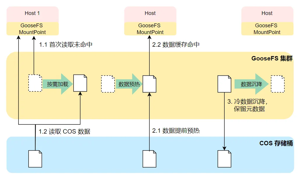 当主机首次从 GooseFS 上读取文件时,GooseFS 发现仅有文件的元数据,会自动读取 COS 桶对应文件,直接返回给主机;通过并行处理技术,加速数据传输性能。