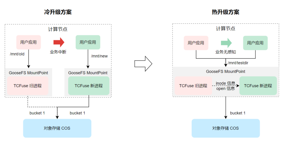 a. 用户只需按照带业务热升级的模式启动新进程,GooseFS MountPoint 即可向旧进程发起暂停指令,保留旧进程的 inode 和 open 信息。