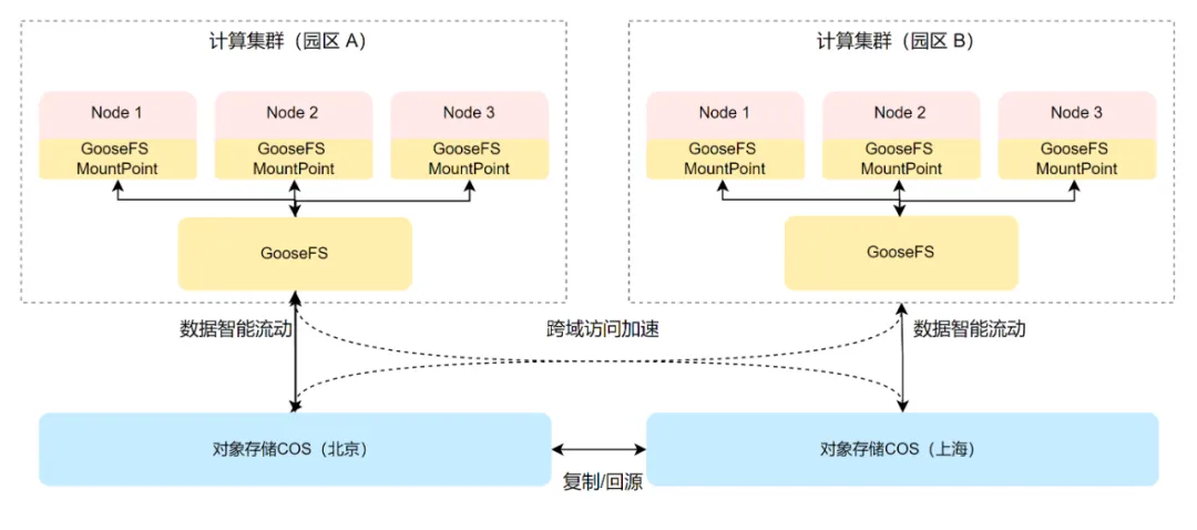 GooseFS 智能数据流动在分层缓存和统一命名空间的基础上,通过按需加载和多种触发模式管理业务数据在 GooseFS 和 COS 之间的流转。数据流动支持通过配置 COS 跨域传输加速域名,能够自动选择最优网络路径,显著降低跨地域访问延迟;在同步数据时也支持增量同步机制,仅传输变化数据块,可以极大节省带宽成本。