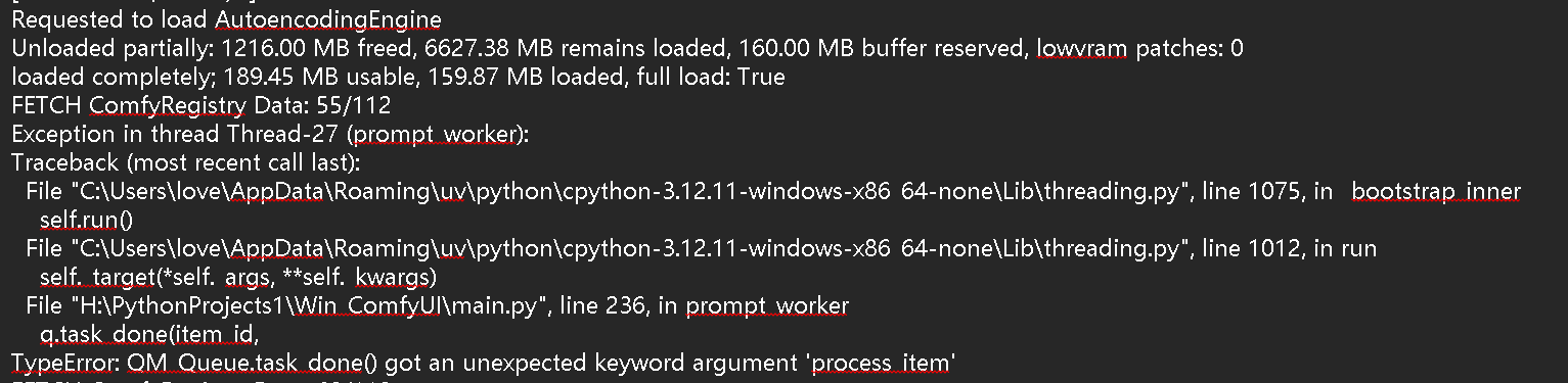 ComfyUI 启动后,后台出现自动恢复任务或手动点击生成时,控制台抛出如下核心错误: