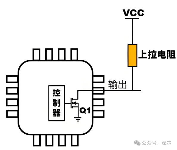 当内部控制逻辑希望输出高电平(1)时,它会断开内部的N-MOSFET开关。此时输出引脚与地之间的连接是断开的,相当于悬空状态(高阻态)。如果没有任何外部元件,这个引脚的电平是不确定的。因此,必须在外部的输出引脚和电源(VCC)之间连接一个上拉电阻。当内部开关断开时,电流会通过这个上拉电阻将引脚电压"拉"到电源电压,从而输出高电平