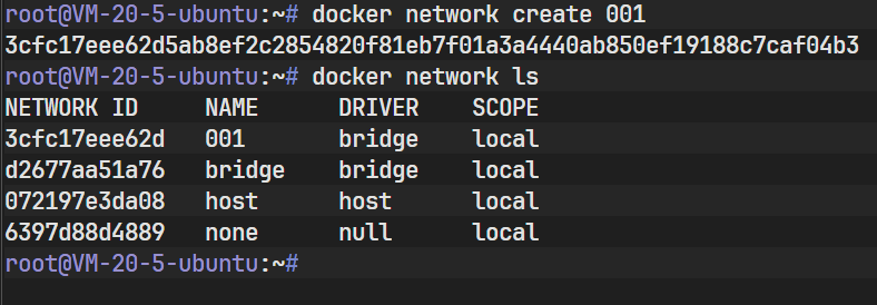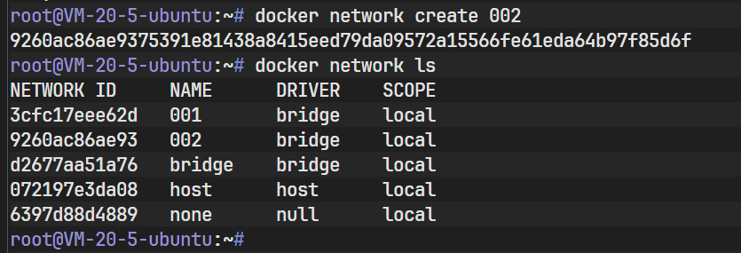 上图返回了一串长哈希值,代表网络创建成功。自定义网络本质上是在宿主机上创建了另一个虚拟网桥(通常命名为 br-<hash>),与默认的 docker0 相互隔离。