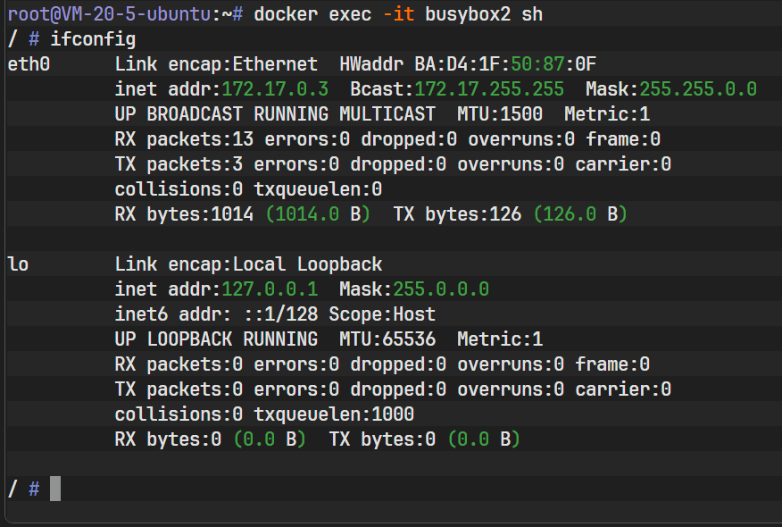 图中显示,busybox1 的 eth0 网卡被分配了 IP 地址 172.17.0.2。这证实了 Docker IPAM(IP 地址管理)组件已经从默认的 172.17.0.0/16 网段中分配了一个地址给该容器。