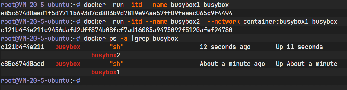 docker run -itd --name busybox2 --network container:busybox1 busybox