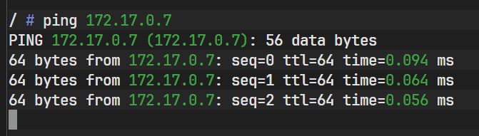 上图展示了 Ping 命令的输出结果,可以看到数据包能够正常发送和接收,延迟(time)显示数值,丢包率(packet loss)为 0%。这证明了在默认 Bridge 网络下,容器间通过 IP 地址可以实现互通。
