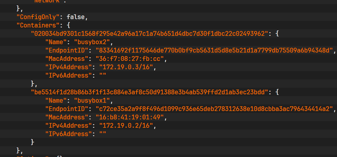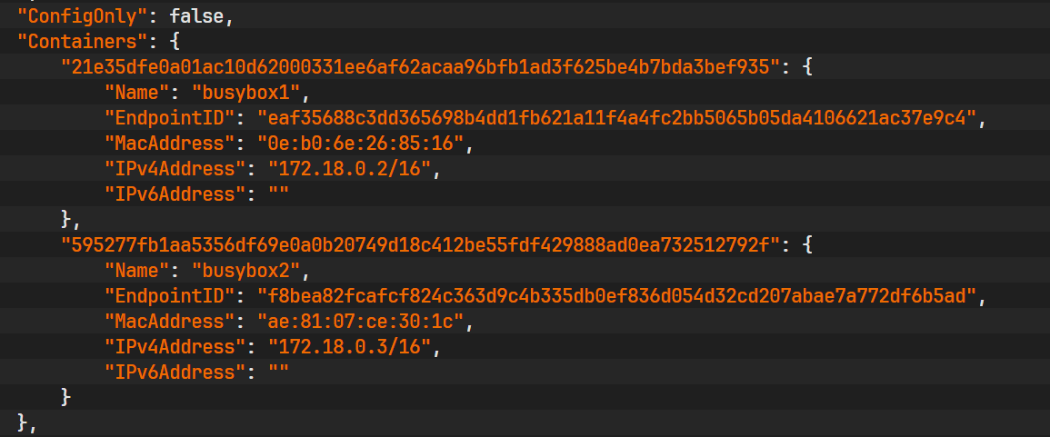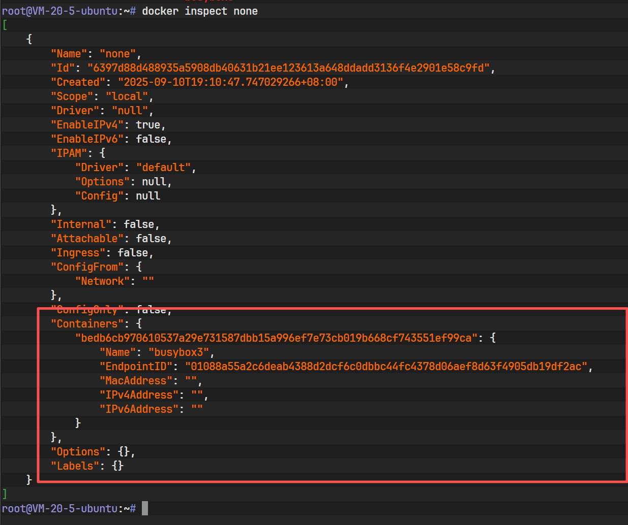 docker inspect 的输出确认了该网络模式下没有配置 Driver 相关的复杂参数,且容器列表中包含了 busybox3。