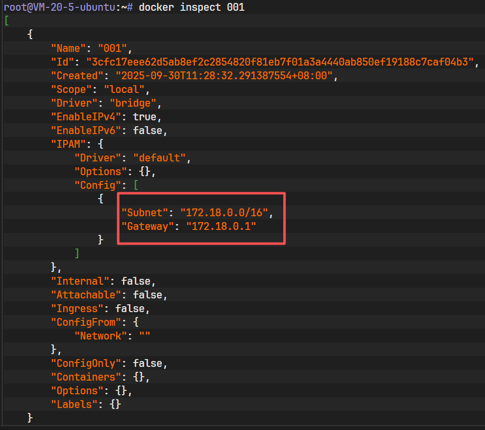 docker inspect 的输出(如图所示)包含了网络的子网配置(Subnet)、网关(Gateway)以及当前连接的容器列表(Containers)。此时列表为空,因为尚未有容器加入。