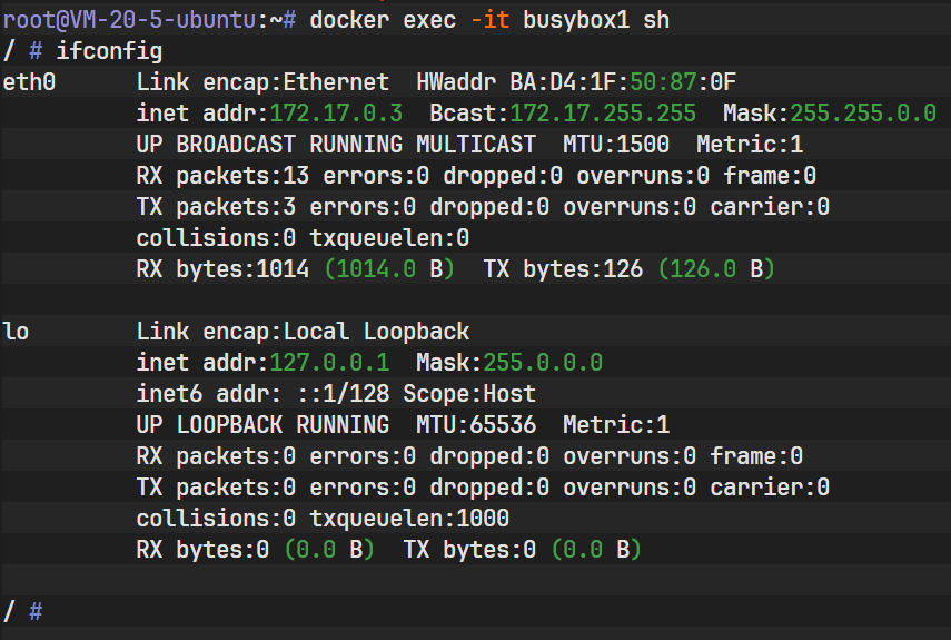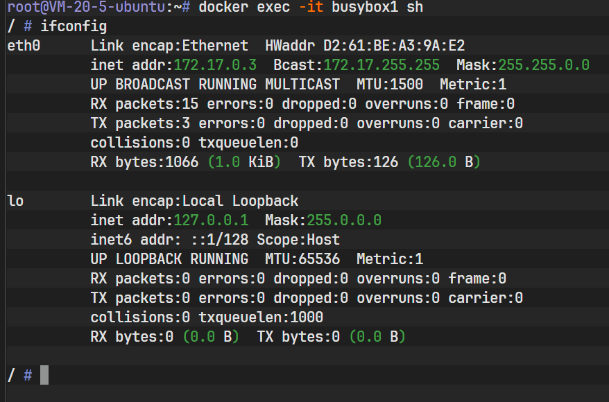 为了探究容器内部的网络配置,需要通过 docker exec 命令进入容器内部。首先进入 busybox1: