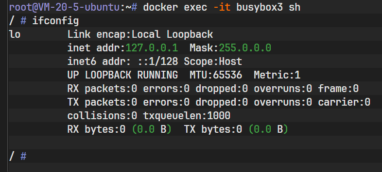 观察上图,busybox2 的网络接口中,原本的 eth0 消失了,只剩下 lo(本地回环)。这意味着它失去了外部通信能力。这说明 Container 模式下的容器网络生命周期紧密绑定于被共享的容器。如果重新启动 busybox1,busybox2 的网络通常会自动恢复(取决于具体配置和 Docker 版本,通常需要重启相关容器)。
