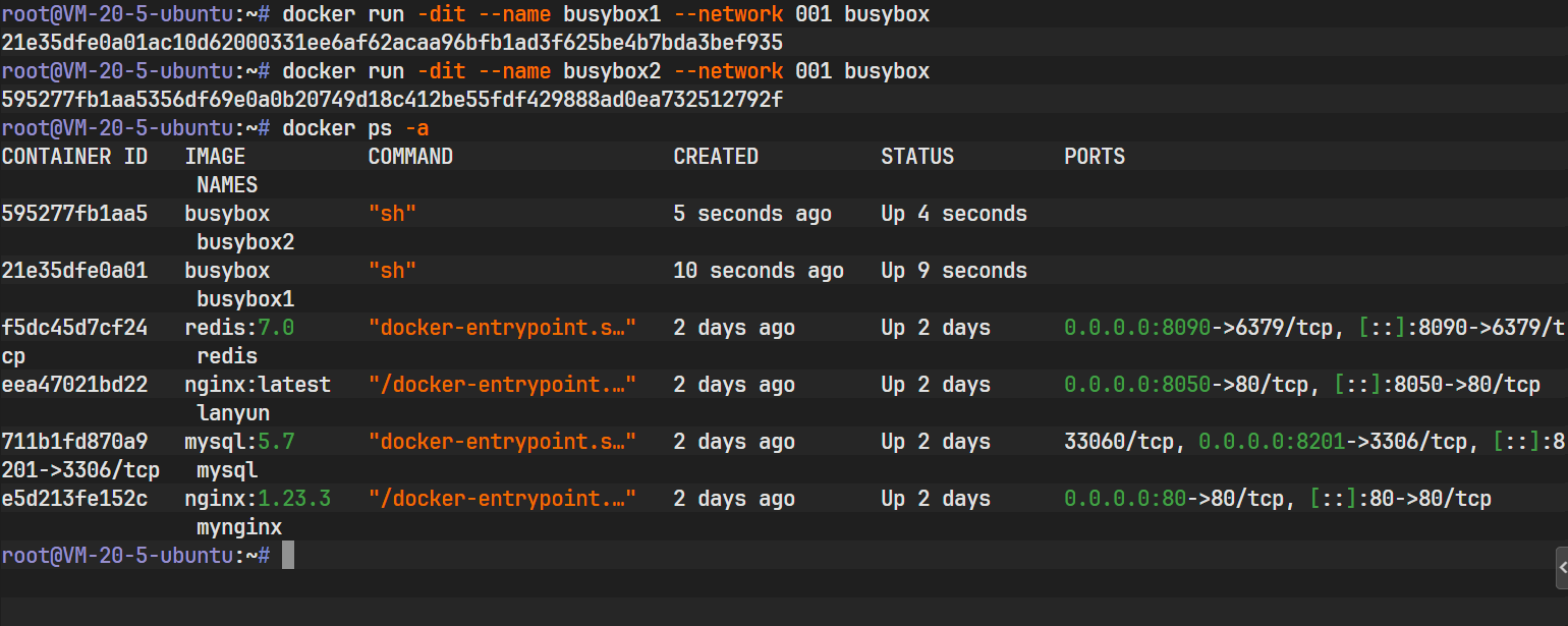 接着,创建第二个容器 busybox2,并使用 --network container:busybox1 参数,指定其共享 busybox1 的网络: