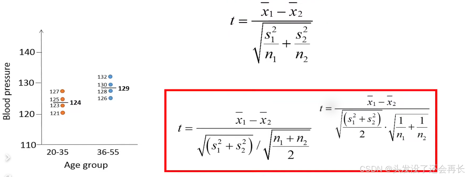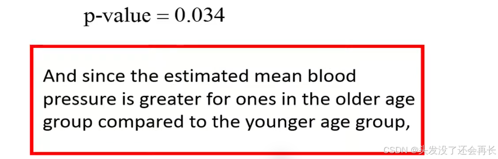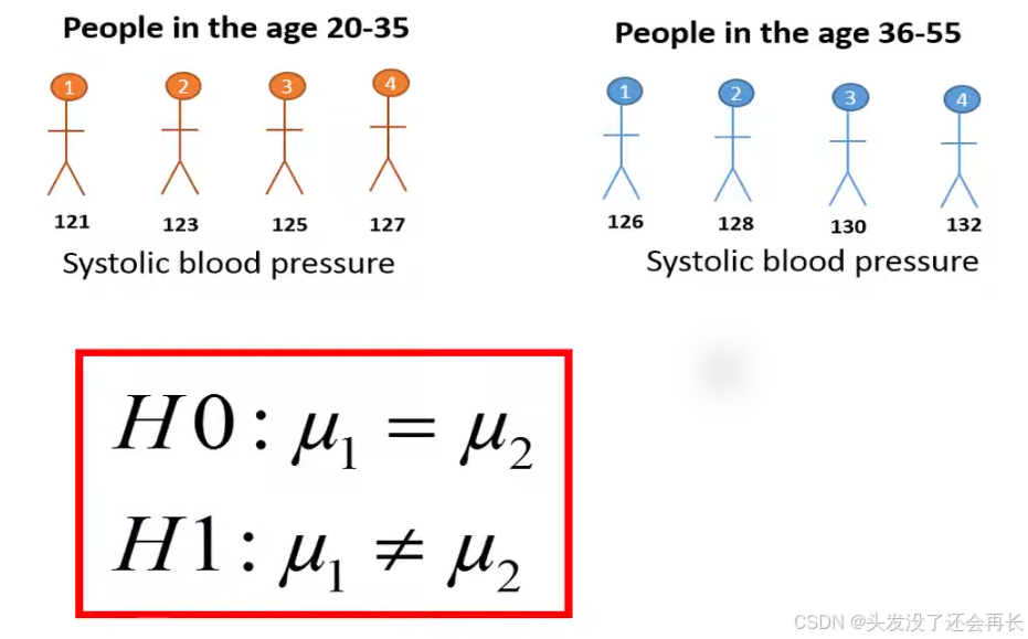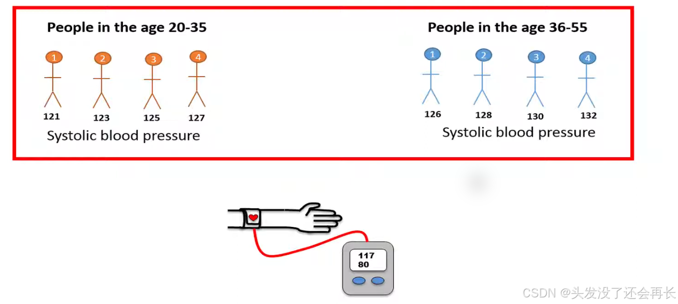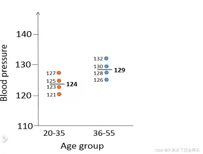 let's first calculate the means stored blood pressure for the two age groups. The means is total blood pressure of the four individuals in the younger group is 124 and 129 of the four individuals in the older group. We can see that the mean pressure is higher in order group than younger group, but we can't be sure if this result is duo to chance , because we randomly choose eight people from population.