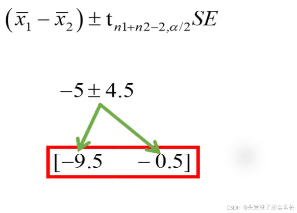we see that we are 95 certain that the two difference between the population means lies somewhere between negative 9.5 and negative 0.5.