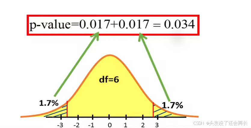 The we can calculate the area at the left-hand side of -2.74 and to the right-hand side of 2.74. We used two-sided test, the area is 0.034, so p-value = 0.034.