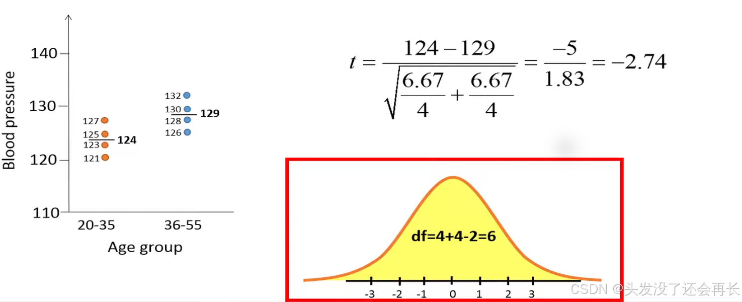 Then we can calculate t=-2.74 , which represents our t statistic this number can be interpreted as the younger individuals have systolic blood pressure that is on average 2.74 standard errors lower than the older individuals.