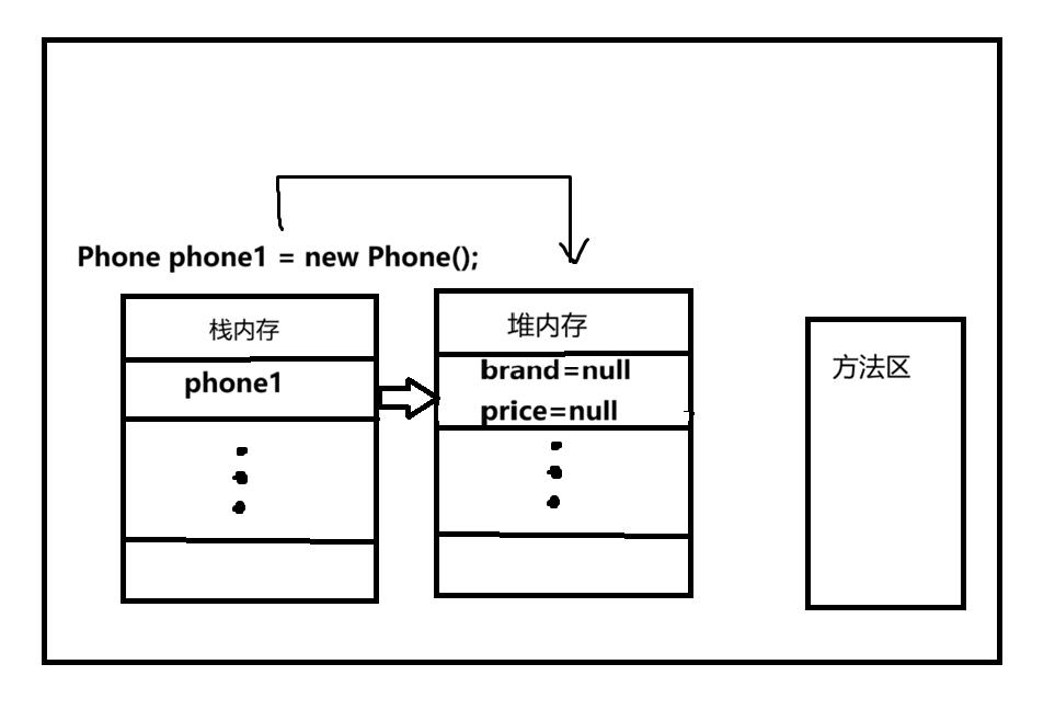 上述代码在main()方法中实例化了一个Phone对象,名称为Phone1。在java中,使用new关键字创建的对象在堆内分配空间。如下图: