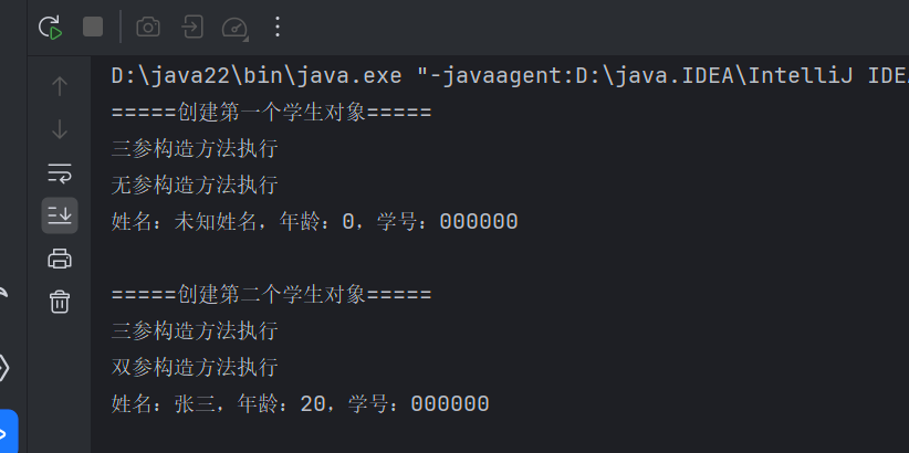 代码中定义了无参、双参、三参 三个构造方法,它们名称与类名一致,仅参数列表不同,这正是构造方法重载的体现。通过重载,实现了不同初始化场景的支持: