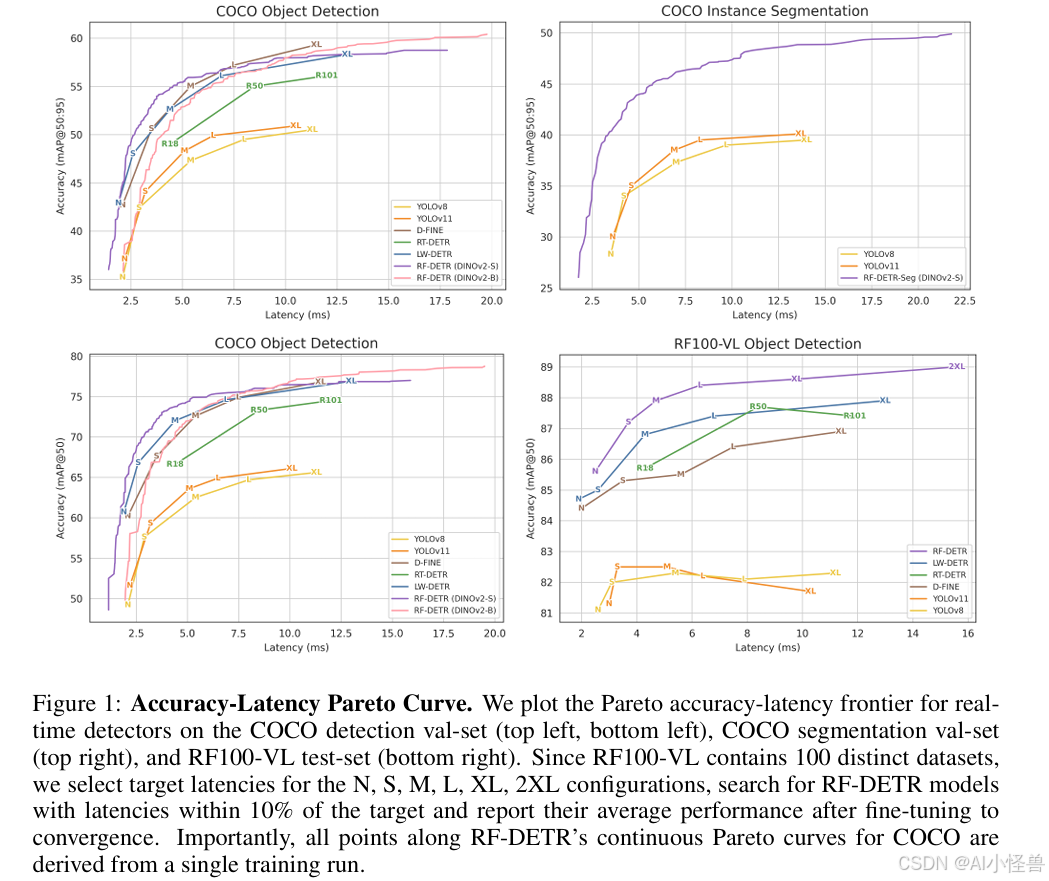 专用检测器是否对COCO过度优化? 目标检测领域的持续进步很大程度上归功于PASCAL VOC(Everingham等人,2015)和COCO(Lin等人,2014)等标准化基准。然而,我们发现,近期的专用检测器通过定制模型架构、学习率调度器和数据增强调度器,隐含地过度拟合COCO,牺牲了在真实世界中的性能。值得注意的是,像YOLOv8(Jocher等人,2023)这样的先进目标检测器,对于数据分布与COCO显著不同的真实世界数据集(例如,每张图像中的物体数量、类别数量、数据集大小)泛化能力很差。为了应对这些局限性,我们提出了RF-DETR,这是一种无需调度器的方法,它利用互联网规模的预训练来泛化到真实世界的数据分布。为了更好地使我们的模型适应多样化的硬件平台和数据集特性,我们在端到端目标检测和分割的背景下,重新审视了神经架构搜索。
