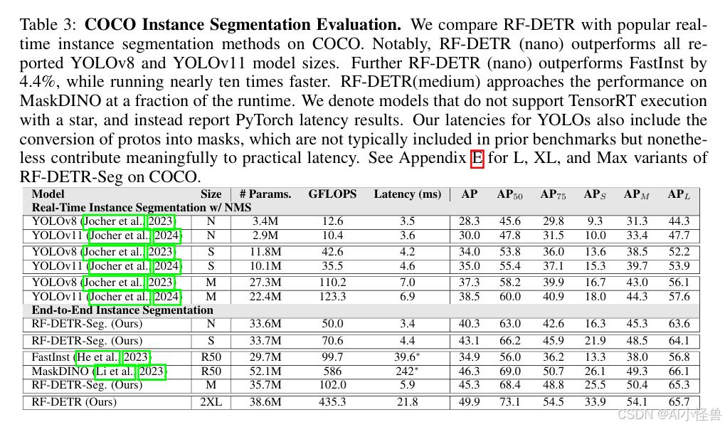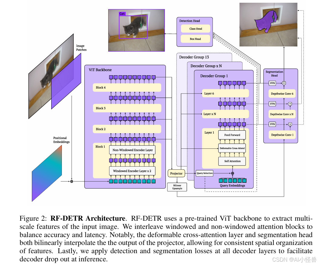 实时实例分割。 受Li等人(2023)的启发,我们添加了一个轻量级实例分割头,以联合预测高质量的分割掩码。我们的分割头对编码器的输出进行双线性插值,并学习一个轻量级投影器来生成像素嵌入图。具体来说,我们为检测头和分割头上采样相同的低分辨率特征图,以确保其包含相关的空间信息。与MaskDINO不同,我们的分割头不融合多尺度主干特征,以最大限度地减少延迟。最后,我们计算所有投影后的查询令牌嵌入(在经FFN变换后的每个解码器层输出处)与像素嵌入图的点积,以生成分割掩码。有趣的是,我们可以将这些像素嵌入解释为分割原型。受LW-DETR关于预训练能提升DETR性能的观察启发,我们在使用SAM2实例掩码进行伪标注的Objects-365数据集上对RF-DETR-Seg进行了预训练。