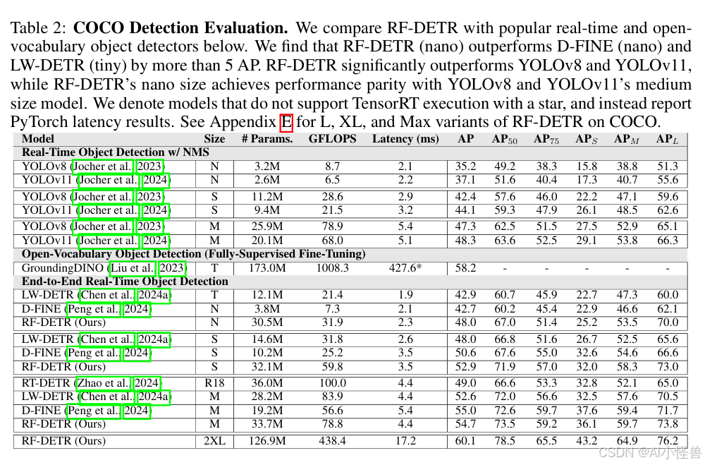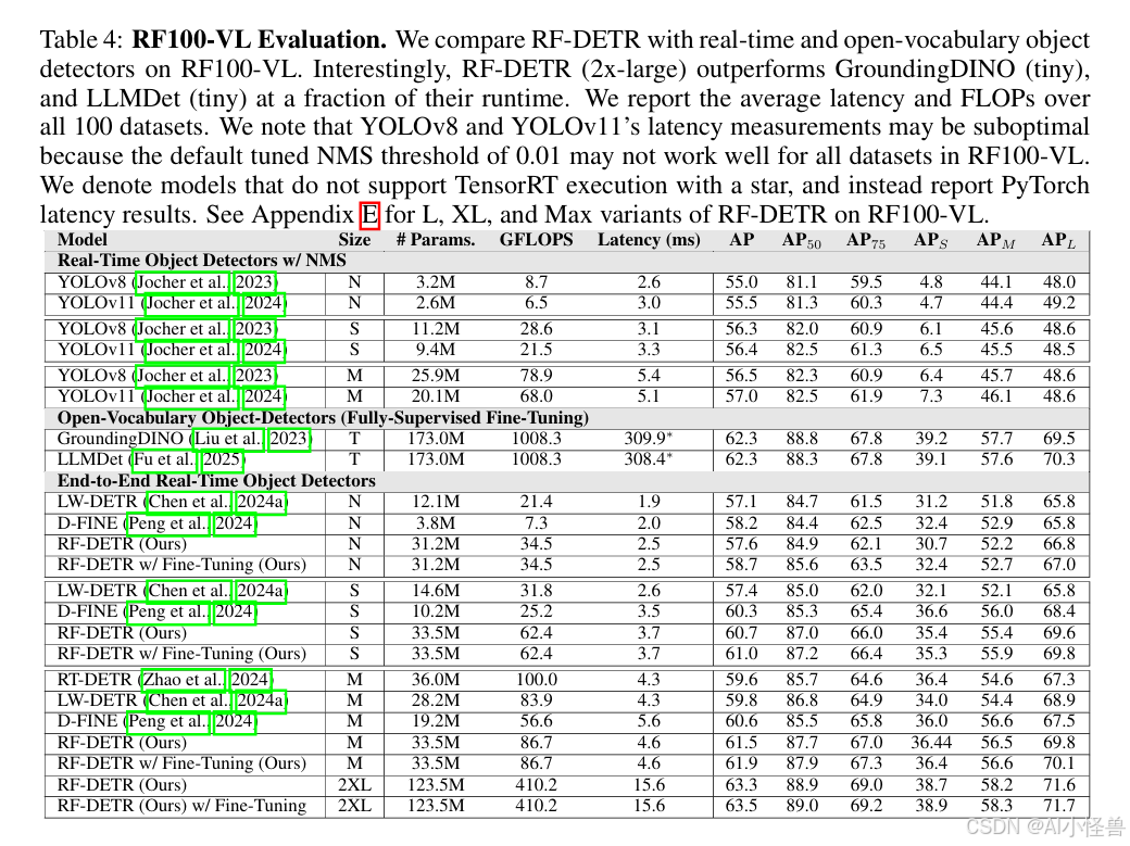 标准化延迟评估。 我们在COCO(Lin等人,2014)和Roboflow100-VL(Robicheaux等人,2025)上评估了我们的方法,并在实时检测器中实现了最先进的性能。RF-DETR(nano)在COCO上以相当的运行时,其AP比D-FINE(nano)高出5%;RF-DETR(2x-large)在RF100-VL上的性能优于GroundingDINO(tiny),同时运行时间仅为后者的一小部分。RF-DETR-Seg(nano)在COCO上的性能优于YOLOv11-Seg(x-large),且运行速度快4倍。然而,将RF-DETR的延迟与先前工作进行比较仍然具有挑战性,因为不同论文中报告的延迟评估差异很大。值得注意的是,每个新模型都会重新基准测试先前工作的延迟,以在其硬件上进行公平比较。例如,D-FINE报告的对LW-DETR(Chen等人,2024a)的延迟评估比最初报告的快了25%。我们发现,这种可复现性的缺失主要归因于推理过程中的GPU功耗限制。我们发现,在前向传递之间进行缓冲可以限制功耗超额,并标准化延迟评估。