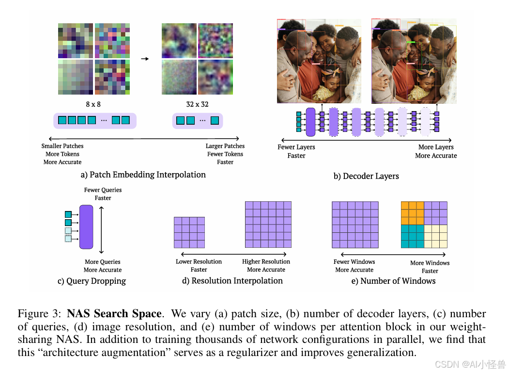 端到端神经架构搜索。 我们的权重共享NAS可评估数千种具有不同输入图像分辨率、块大小、窗口注意力块数量、解码器层数和查询令牌数的模型配置。在每次训练迭代中,我们均匀地随机采样一个模型配置并执行梯度更新。这使得我们的模型能够高效地并行训练数千个子网络,类似于使用丢弃法的集成学习。我们发现这种权重共享NAS方法在训练时还能起到正则化的作用,有效地执行"架构增强"。据我们所知,RF-DETR是首个应用于目标检测和分割的端到端权重共享NAS。下文我们将描述各个组成部分: