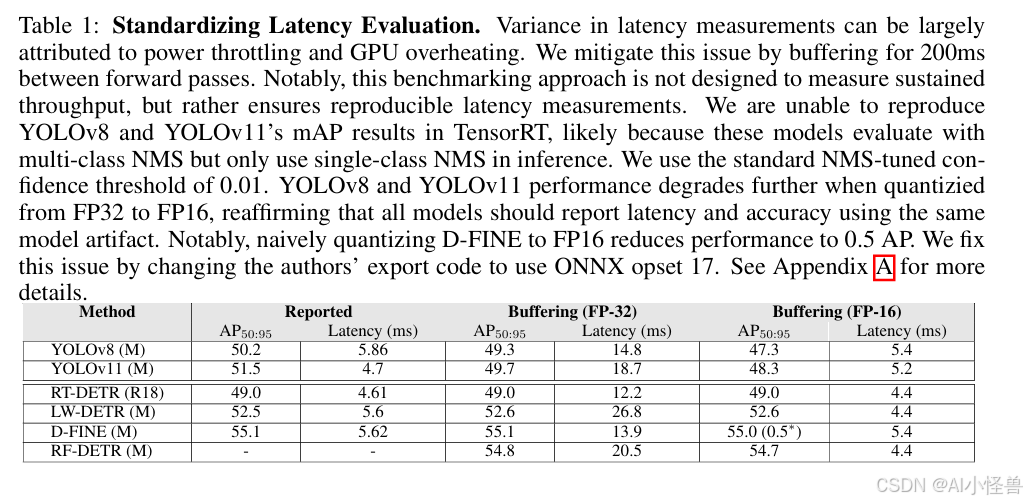 表1:标准化延迟评估。延迟测量的差异很大程度上可归因于功耗限制与GPU过热。我们通过在连续前向传播之间设置200毫秒的缓冲来缓解此问题。需要指出的是,此基准测试方法并非旨在测量持续吞吐量,而是确保延迟测量的可复现性。我们无法在TensorRT中复现YOLOv8和YOLOv11的mAP结果,这很可能是因为这些模型在评估时使用了多类别NMS,而在推理时仅使用了单类别NMS。我们采用了标准经NMS调整的置信度阈值0.01。当从FP32量化至FP16时,YOLOv8和YOLOv11的性能进一步下降,这再次表明所有模型都应使用相同的模型文件来报告延迟与精度。值得注意的是,将D-FINE简单量化到FP16会使其性能下降至0.5 AP。我们通过修改作者的导出代码以使用ONNX opset 17修复了此问题。详见附录A以获取更多细节。
