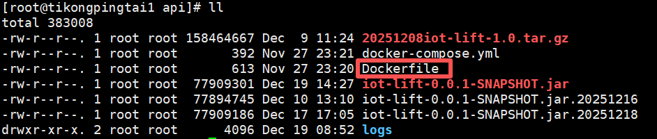 编写完Dockerfile文件后,将编译好的打包文件iot-lift-0.0.1-SNAPSHOT.jar 放入到和Dockerfile相同的目录下,通过执行:docker build -t iot-lift:1.0 . 就可以制作镜像了,制作完镜像后,可以通过docker run 镜像 来运行容器。