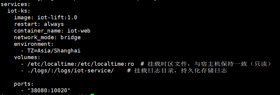 注意:ports格式为:宿主机端口:容器端口,上述示例就是宿主机的38080端口映射到容器的10020端口