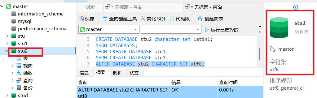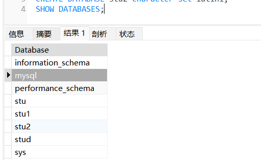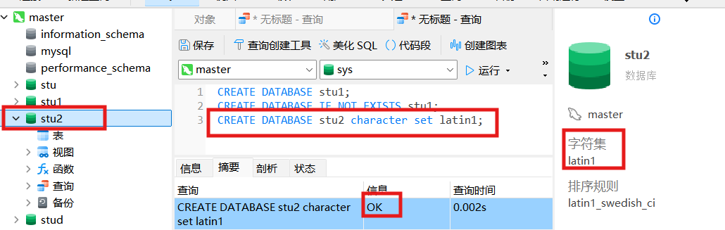 建立数据库stu2并指定字符集,如果没指定,就会默认utf8mb4,我们建立的stu1就是这种字符集