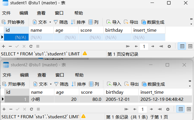 当我们在stu2中建立表格其中的字段名也就是列名类型是字符类型,在该字段输入数据的时候字符串是中文就会报错,虽然输入的字符串但是不支持中文格式,但在stu1可以,就是因为这个字符集的设置