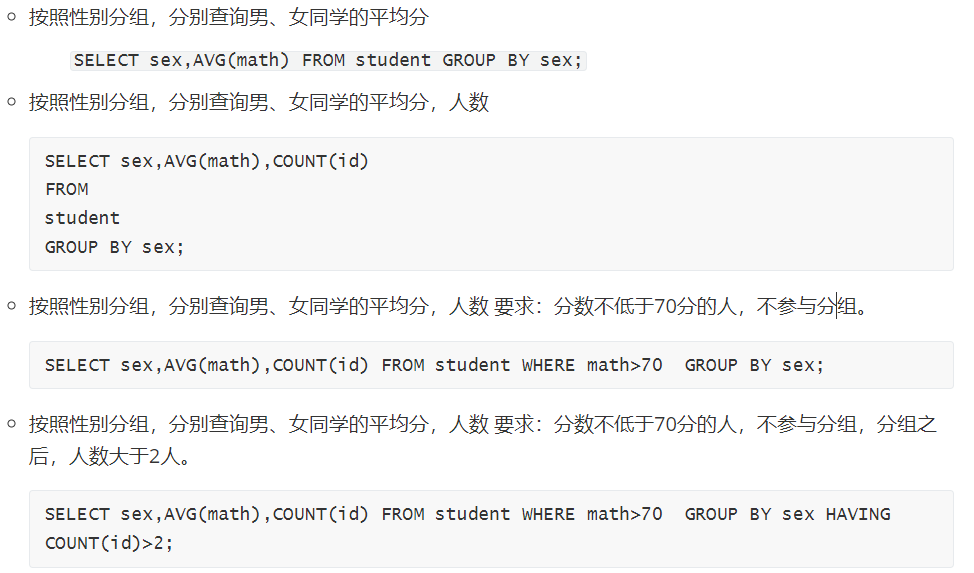 将一列数据作为一个整体,进行纵向的计算,注意,聚合函数的计算,排除null值(可使用ifnull函数)