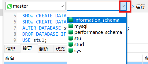 这个语句使用最多的是在我们的linux命令行中操作时经常用到,比如我们要建立表等,添加数据等......需要确定使用哪个数据库。如果是在这个可视化界面,我们建表等操作的时候,这个句子是配和建表等操作一块使用的,除此之外我们也可以在直接选择数据库,如下选择一个我们想进行操作的对象。