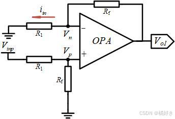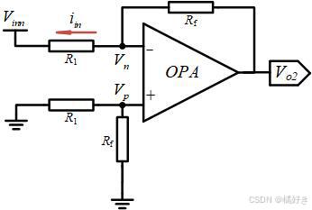 V_p = 0 =V_n \\tag{1-4}$$$$i_{in} = \\dfrac{V_n-V_{inn}}{R_1} \\tag{1-5}$$$$V_{o2} = V_{inn} + i_{in} \\cdot (R_1 + R_f) = V_{inn} + \\dfrac{0-V_{inn}}{R_1} \\cdot (R_1+R_f) = - V_{inn} \\cdot \\dfrac{R_f}{R_1} \\tag{1-6}