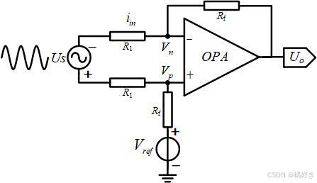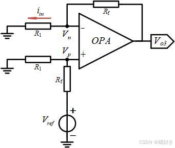 V_p = V_{ref} \\cdot \\dfrac{R_1}{R_1 + R_f} = V_n \\tag{1-7}$$$$i_{in} = \\dfrac{V_n-0}{R_1} \\tag{1-8}$$$$V_{o3} = i_{in} \\cdot (R_1 + R_f) = \\dfrac{\\dfrac{V_{ref} \\cdot R_1}{R_1 + R_f}}{R_1} \\cdot {R_1+R_f}= V_{ref} \\tag{1-9}