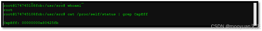 执行whoami返回root用户,执行cat /proc/self/status | grep CapEff查看效果