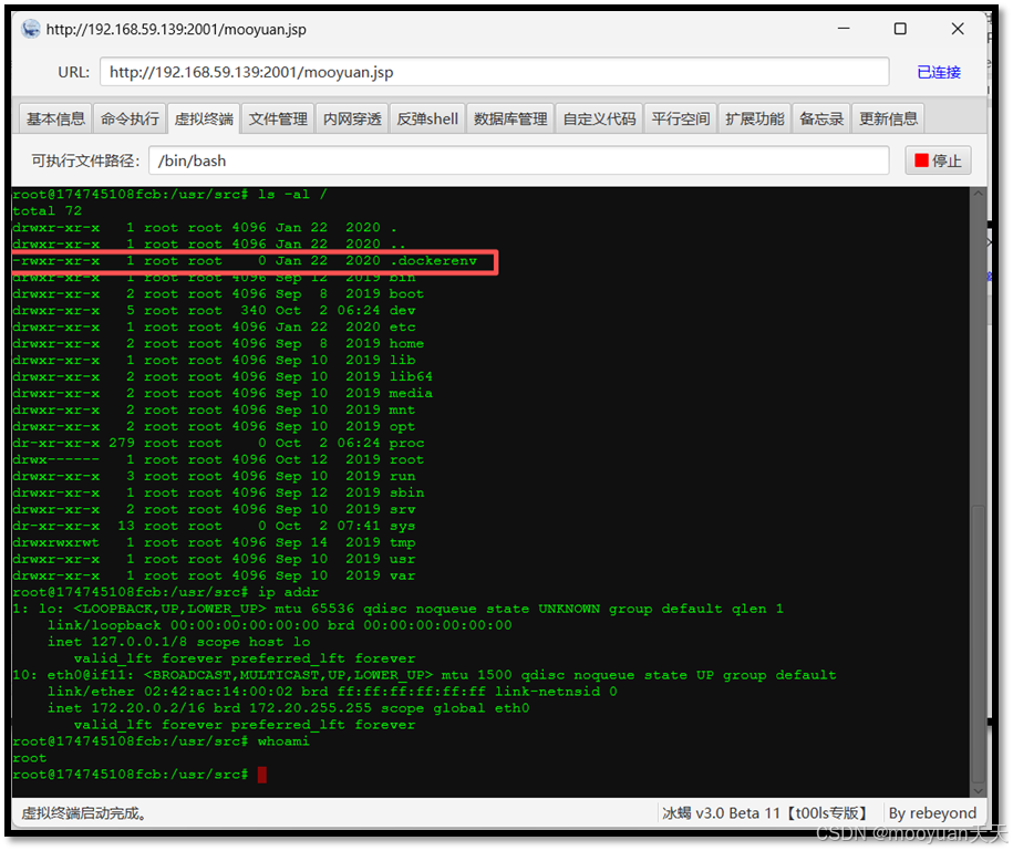 在蚁剑工具的虚拟终端中执行ls -a /命令,发现docker文件,说明这是个Docker环境。