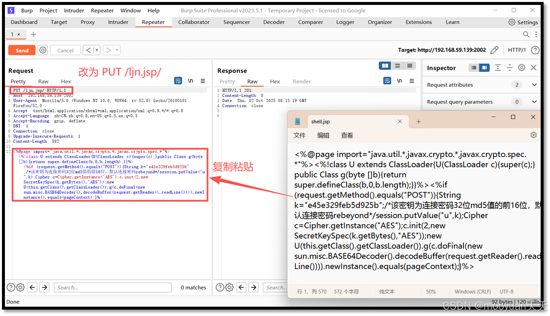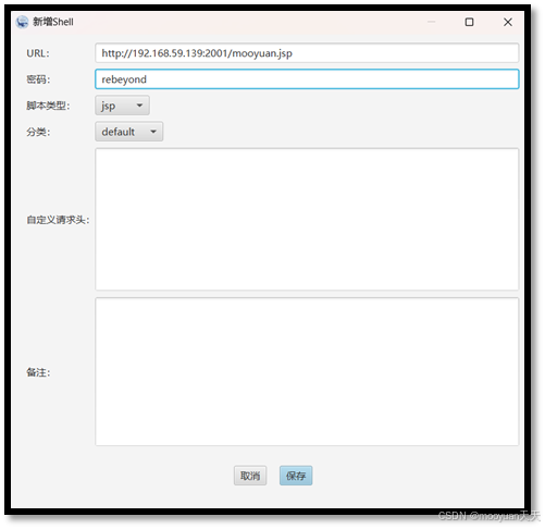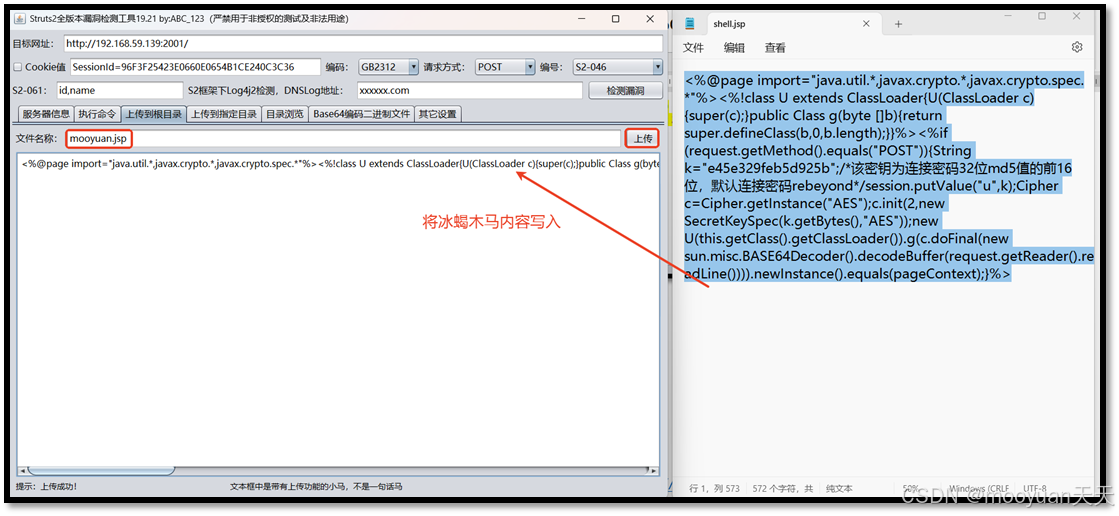 将冰蝎木马上传,在输入框中粘贴冰蝎木马shell.jsp的内容,将木马命名为mooyuan.jsp,点击上传,提示上传成功,如下所示。