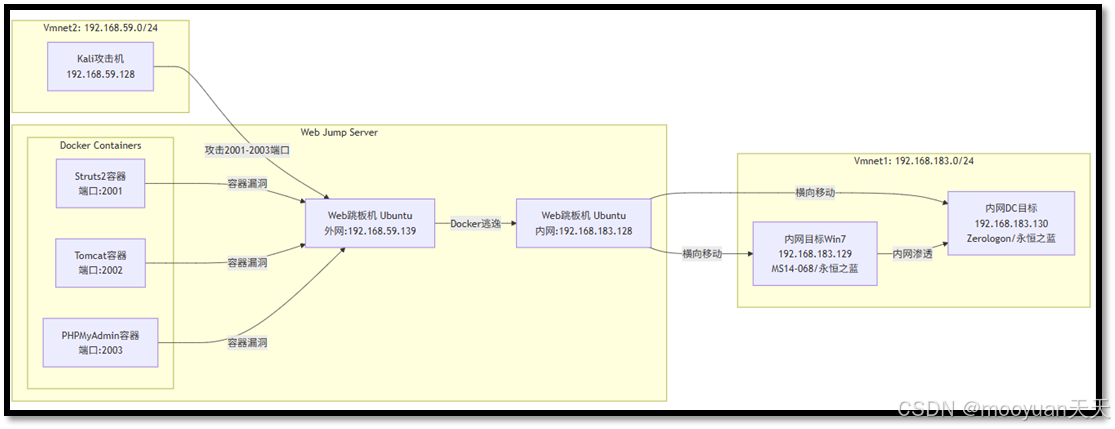 本渗透测试环境构建了一个典型的多层网络攻防场景。Kali攻击机位于外部网络,首先针对Ubuntu跳板机上的三个Docker容器服务(Struts2-2001端口、Tomcat-2002端口、PHPMyAdmin-2003端口)发起攻击,在获取容器权限后需要完成Docker逃逸和Ubuntu主机Root提权。成功控制这台双网卡跳板机后,攻击者以其为桥头堡渗透内部网络,依次横向移动至Windows 7工作站和Windows Server 2008域控制器,分别利用MS14-068、Zerologon和永恒之蓝漏洞实现权限提升,最终完成从外网到内网、从容器到主机的完整攻击链,全面检验容器安全、权限维持和内网横向移动等关键攻防能力。