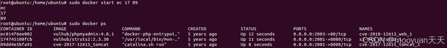 使用sudo docker start ec 17 09 命令启动服务,启动后使用docker ps查看启动效果,如下所示启动成功。