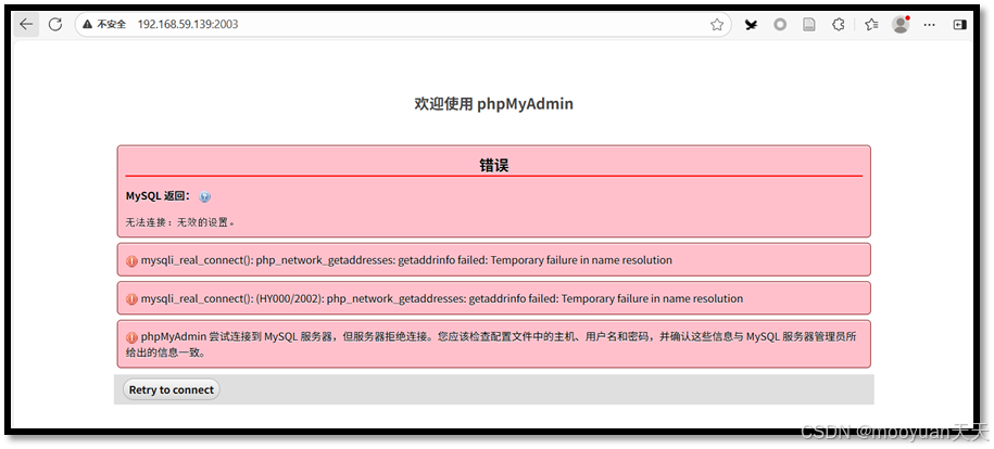 访问http://192.168.59.139:2003 提示这是一个phpmyadmin页面,但是有报错,如下所示。