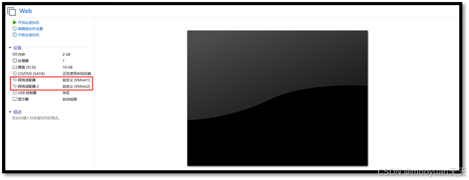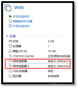 Web为跳板机,两个网卡分别设置为主机模式vmnet1和vmnet2,具体如下所示。