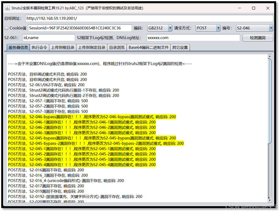 在目标网址输入http://192.168.59.139:2001/ 点击检测漏洞,输入如下所示。