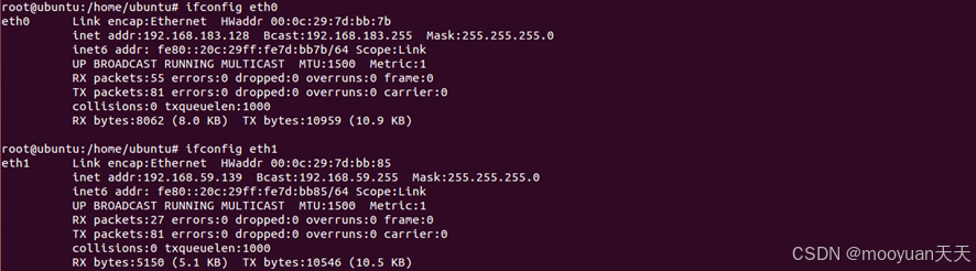 使用ifconfig eth0和ifconfig eth1查看ip地址,如下所示。
