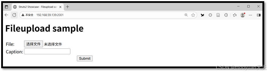 访问http://192.168.59.139:2001 提示这是一个struts2的文件上传页面,如下所示。