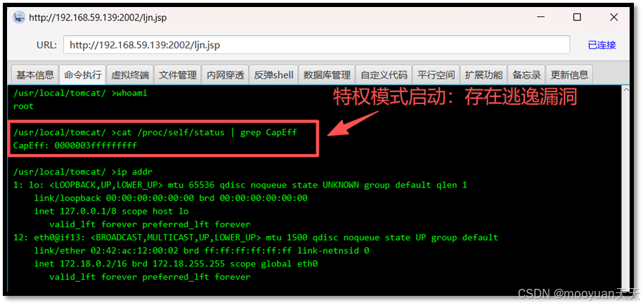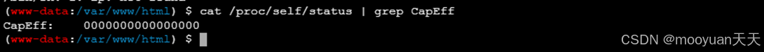 执行whoami返回www-data用户,执行cat /proc/self/status | grep CapEff查看效果